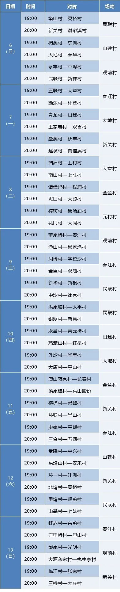 La competencia se celebró en nueve zonas de competencia: Village Minlian en Dongzhou Subdistrict; Pueblo de Dadi, pueblo de Jinzhu y pueblo de Guanqian (Zhougongwu) en el subdistrito de Yinhu; Village de Chunjiang y Village de Shanjian en el subdistrito de Chunjiang; Village Yuan en la ciudad de Xindeng; el Hall de baloncesto de la ciudad de Changlv; y el pueblo de Xinguan en la ciudad de Dayuan . Este año, aún más personas podrán ver los emocionantes juegos justo en su puerta.